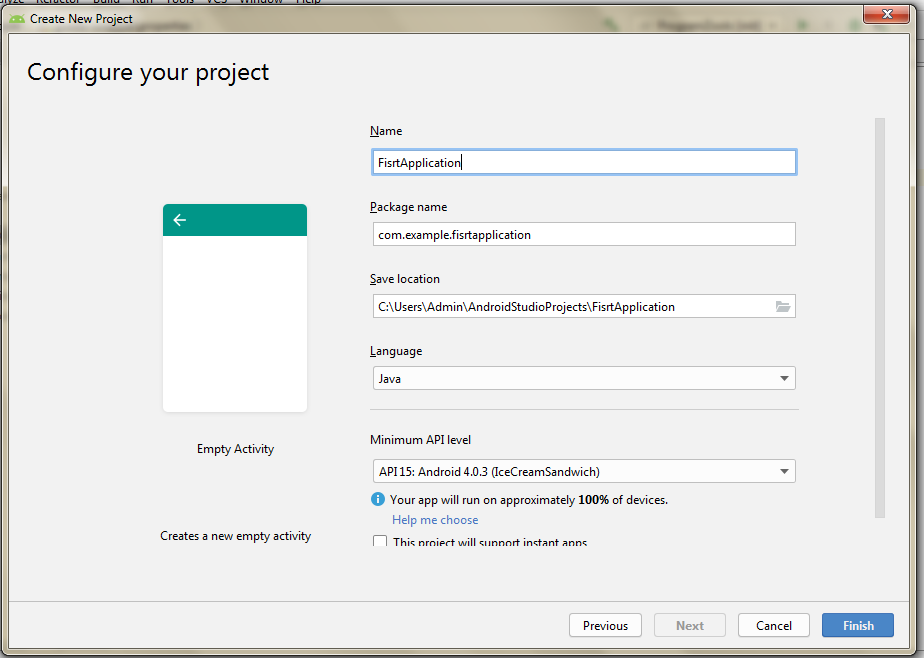 - Configure your Project Window appears, Type name of your project and Package name in their respective boxes, choose preferred language and click Finish